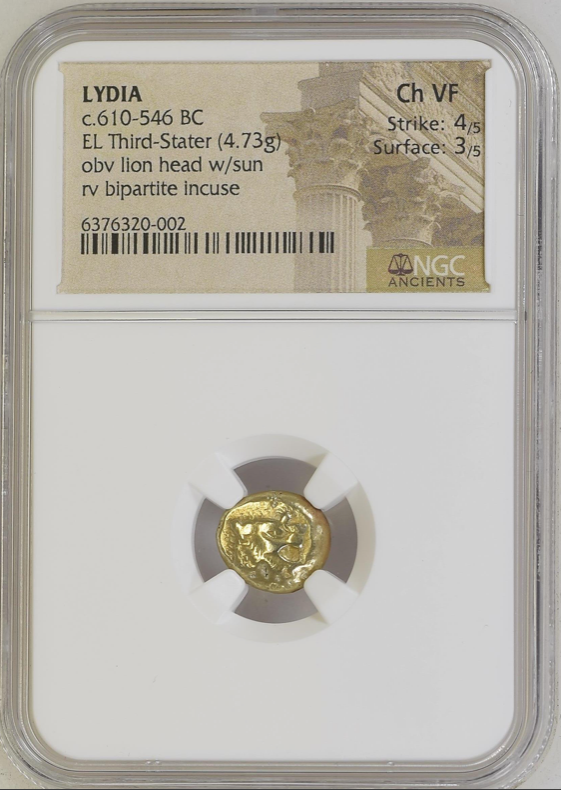 表面にはリディア王国の象徴であるライオンの頭部と放射状の太陽が精緻に刻まれています。このトライトは当時の兵士の給料およそ1か月分に相当し、政治的支払い、貿易、軍事活動に広く使用された歴史的価値の高い貨幣です。
